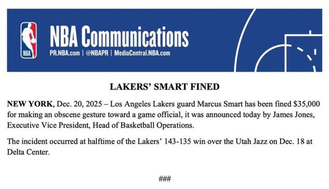 北京時間12月21日,NBA官方宣布,湖人后衛馬庫斯-斯馬特因“向賽場裁判做出不雅手勢”,被處以3.5萬美元罰款。